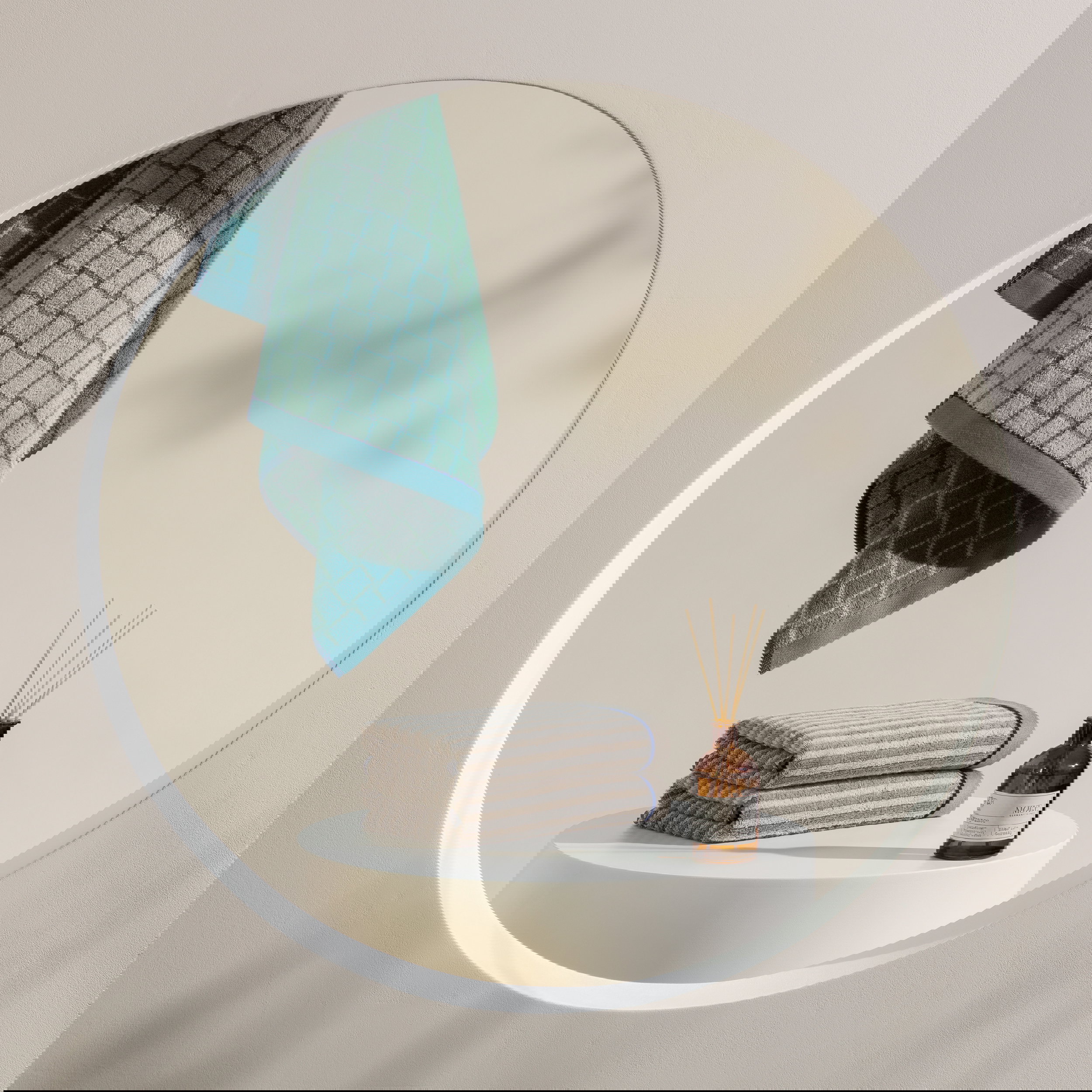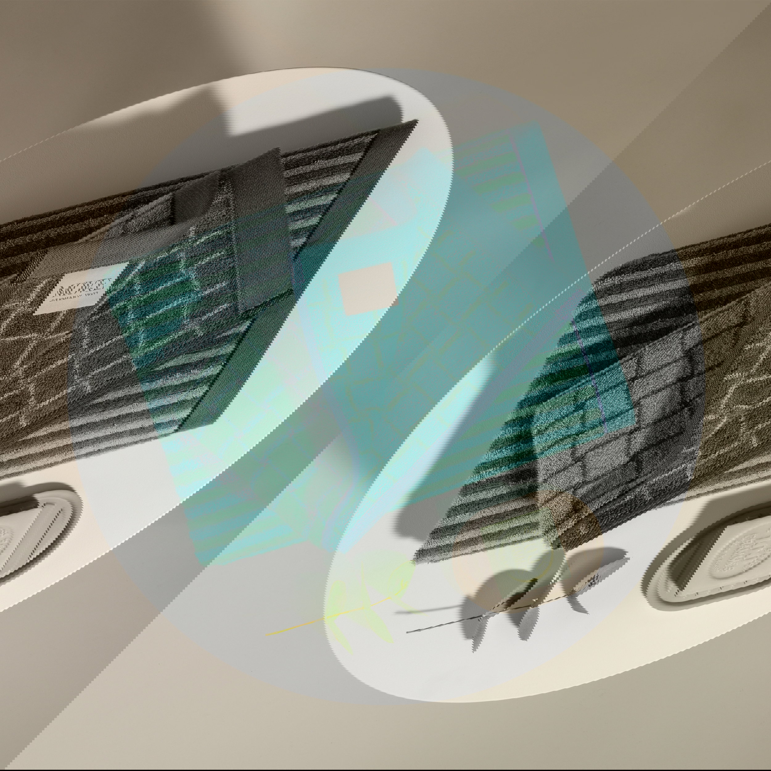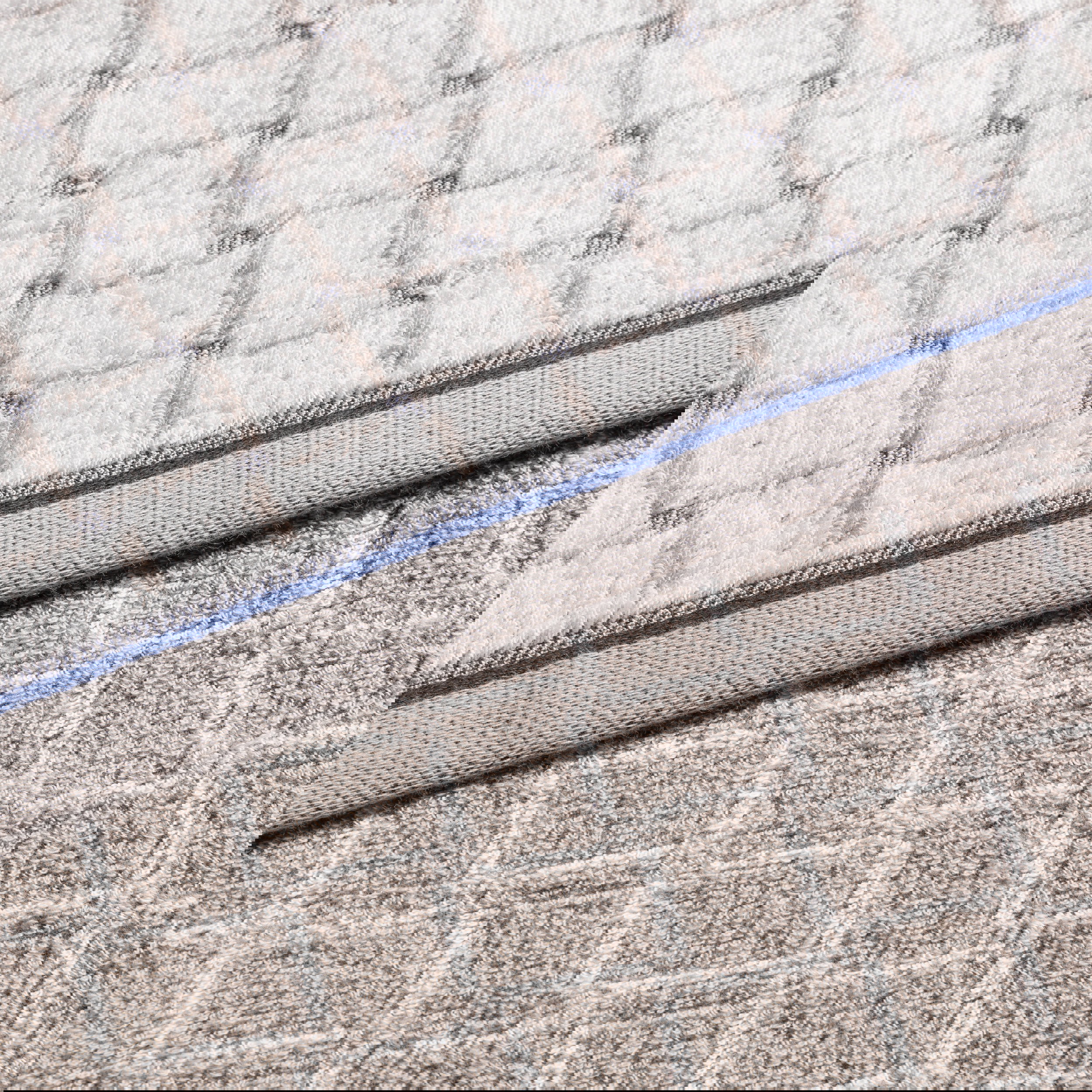 Soft, soothing colours are shaping many interior concepts right now – they create balance and bring harmonious calm into the room. Our first edition, MÖVE GEOMETRIC SHAPES, enhances this effect with graphic, intricately woven jacquard patterns featuring a subtle high-low structure and refined relief look. A special highlight is the double-face effect: the front and back show the pattern in reversed colouration, adding an extra visual twist. Thoughtful details – such as the contrast hanging loop and a unified border with a distinctive blue accent – complete the design.
